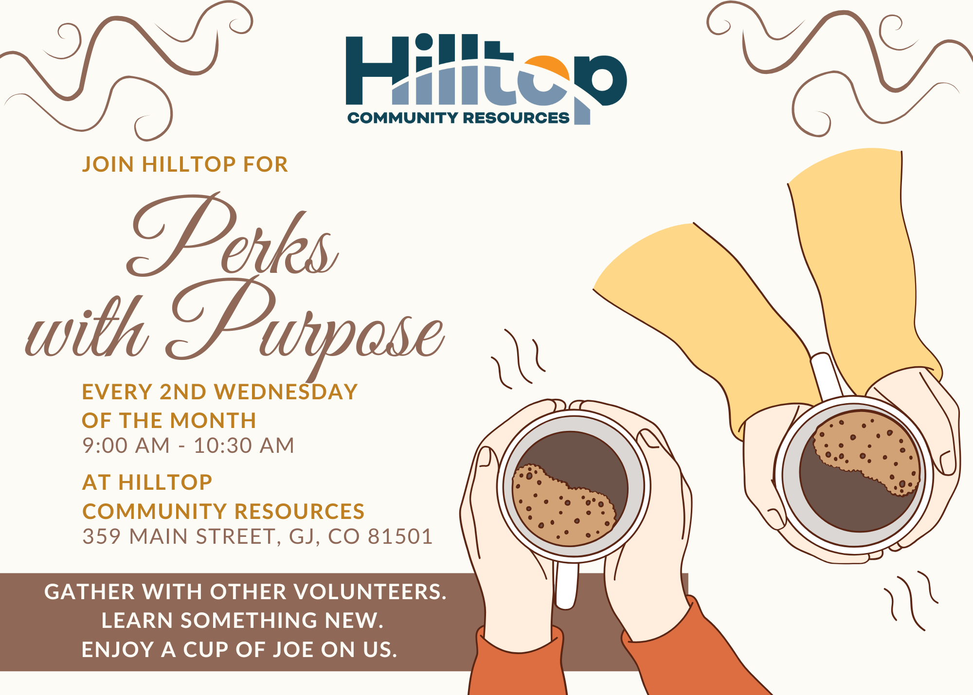 At Hilltop Community Resources, we know something special about our volunteers: you don’t just give your time, you share your passion. Every day, Hilltop volunteers bring compassion, creativity, and dedication to the people and programs they support. Your service strengthens our community in ways that truly matter, and we are endlessly grateful.