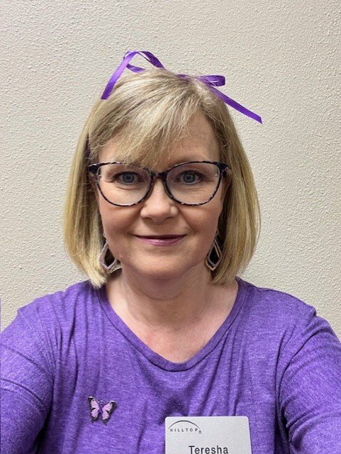Teresha Taylor began her journey with Hilltop in February 2015 after years as a stay-at-home mom and managing her husband’s psychology practice. What started as a part-time front desk role quickly evolved into a full-time position and eventually into a supervisory role. Teresha’s title is Support and Volunteer Services Coordinator, but that hardly describes the impact she has on Hilltop participants, staff and the community.    One of Teresha’s roles is coordinating and supporting ten dedicated Latimer House Crisis Line volunteers, by facilitating the required background checks, guiding them through the rigorous domestic violence and sexual assault training, checking in with them each month to discuss hours, offer support and coordinate schedules. Many of these volunteers are survivors themselves, and Teresha deeply admires their courage and commitment to giving back. Her advice to Latimer House Crisis line volunteers is “Pace yourself through the training and beyond. It’s hard and can be triggering, so self-care is a must.”