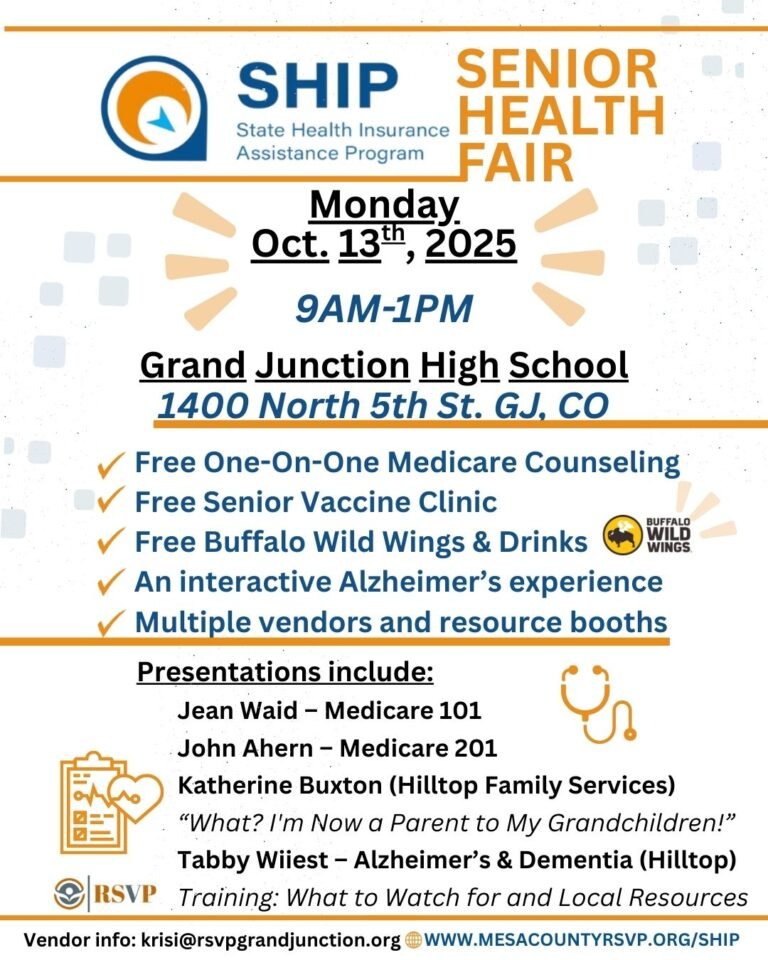 SHIP State Health Insurance Assistance Program is hosting a Senior Health and Resource Fair on Monday, October 13, 2025 at Grand Junction High School and Hilltop is proud to be a Silver Sponsor. Hilltop’s very own Katherine Buxton and Tabby Wiiest are presenters.